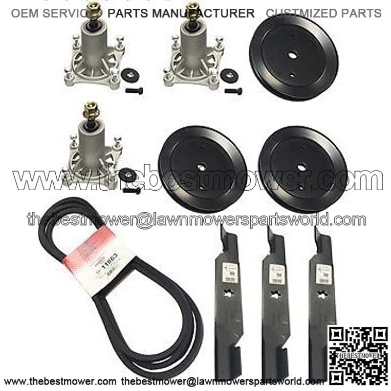 3 Spindle Assemblies Compatible with 187292 3 Spindle Pulleys (OD 5-1/8″) Compatible with 129861 / 153535 / 173436 3 Blades (18-1/2″) Compatible with 187256 / 187254 1 Deck Belt (148″ x 5/8″) Compatible with 196103 Fits many 54″ Deck Mowers (Check description for more information)