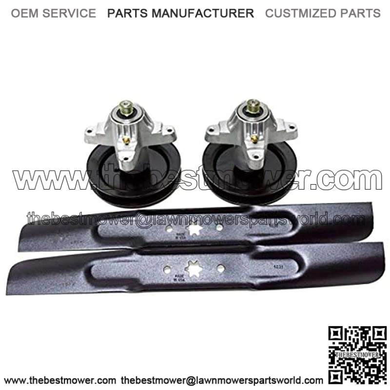 This kit includes two spindles. The spindles replace part numbers Cub Cadet/MTD 918-04456, 918-04456A, 918-04456B, 918-04461, 618-04456, 618-04456A and 618-04461. Specs: OD Pulley: 6 3/16″ Height: 6″. Specially designed spindle shaft to replace 6 pt. star. Grease zerk and mounting bolts included. Two blades that replace Cub Cadet/MTD 742-04308, 742-0616, 742-0656, 942-04126, 942-04308, 942-04312, 942-0616A, 942-0656, 742-04126, 742-04308, 742-0656, 942-0616, 942-0656, 94204126, 94204308. And Toro 112-0315. Troy Bilt 742-0656, 942-0656 and Windsor 50-3252. Blade specs length: 21 3/16″ width: 3″ thickness: 0.1500″ diameter outside holes: 5/16″ center to center (outside holes): 2 1/2″. 6 pt star center hole. Fits models: Super Troy Bilt and Super Bronco Range Pony mowers. Numbers 13AD771G731, 13AJ771G004, 13AJ771H031, 13AJ771G204,13AJ771G231, 13AJ775G059, 13AJ795G204, 13AM772G755, 13AN772G000, 13AN772G029, 13AN772H055, 13RN772H229 and 13RN772G729. And Cub Cadet LT1042.